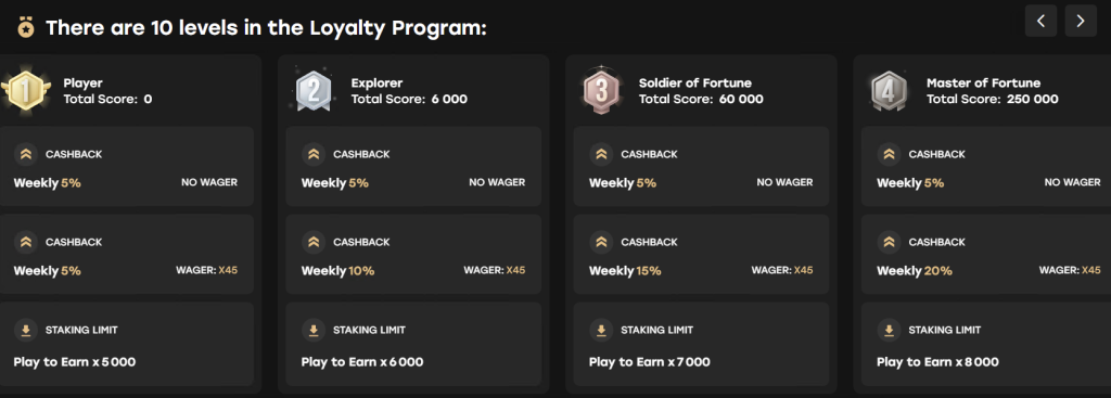 Vår lojalitetstrappa är uppdelad i 10 tydliga nivåer, från ”Player” till den eftertraktade ”Platinum Card”-statusen. Varje nivå baseras på dina intjänade TFS-tokens genom spelande.
